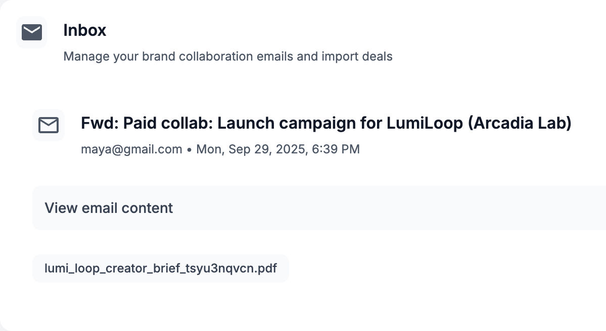 Forward anything and Collabed instantly builds a structured deal with dates, deliverables, contacts, and tasks so creators stop losing details in scattered inboxes.
